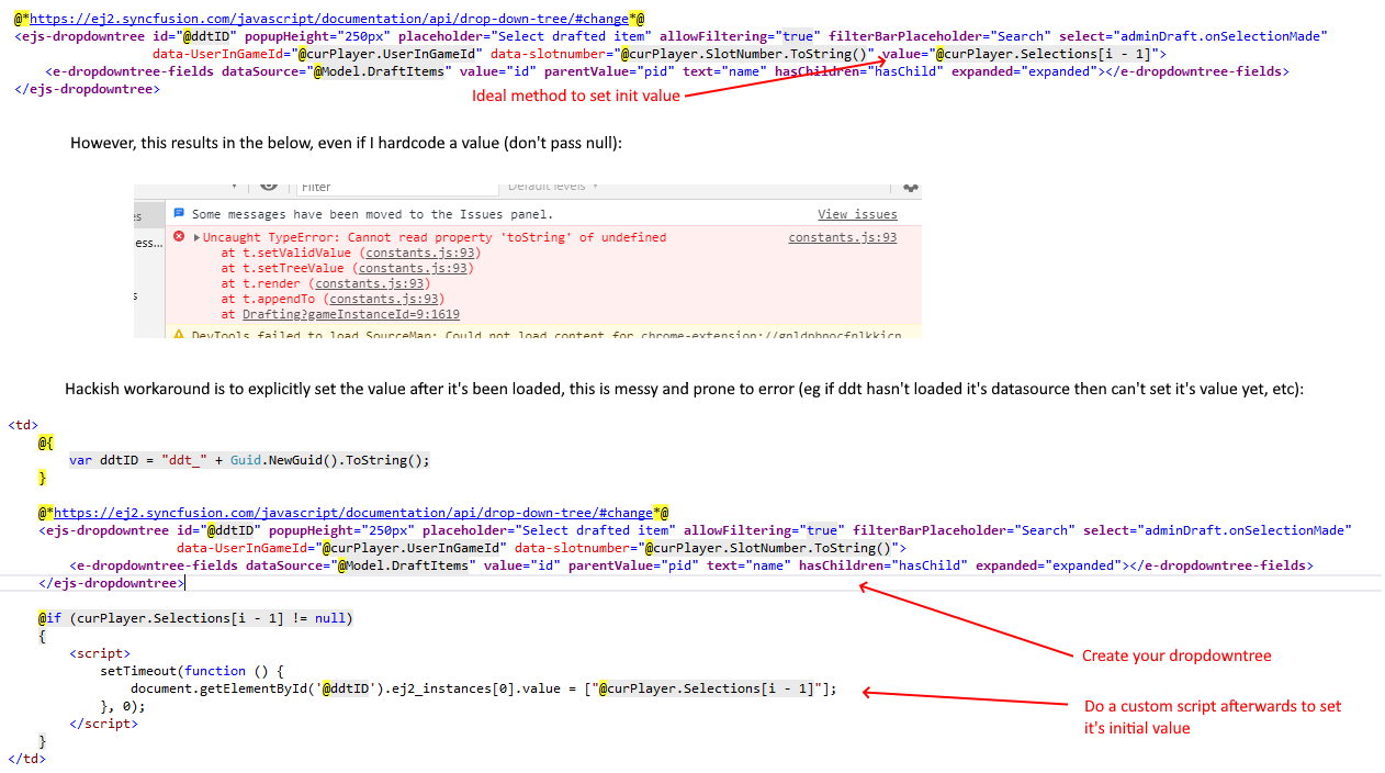When I create a dropdowntree I see the 'value' option, but when I set it I get an error inside your code. If I set it myself after everything is loaded via javascript directly then it works but no way to set the initial value via your builder. The way I have it setup is a hack in my opinion, better to set it inside your tag helper itself.