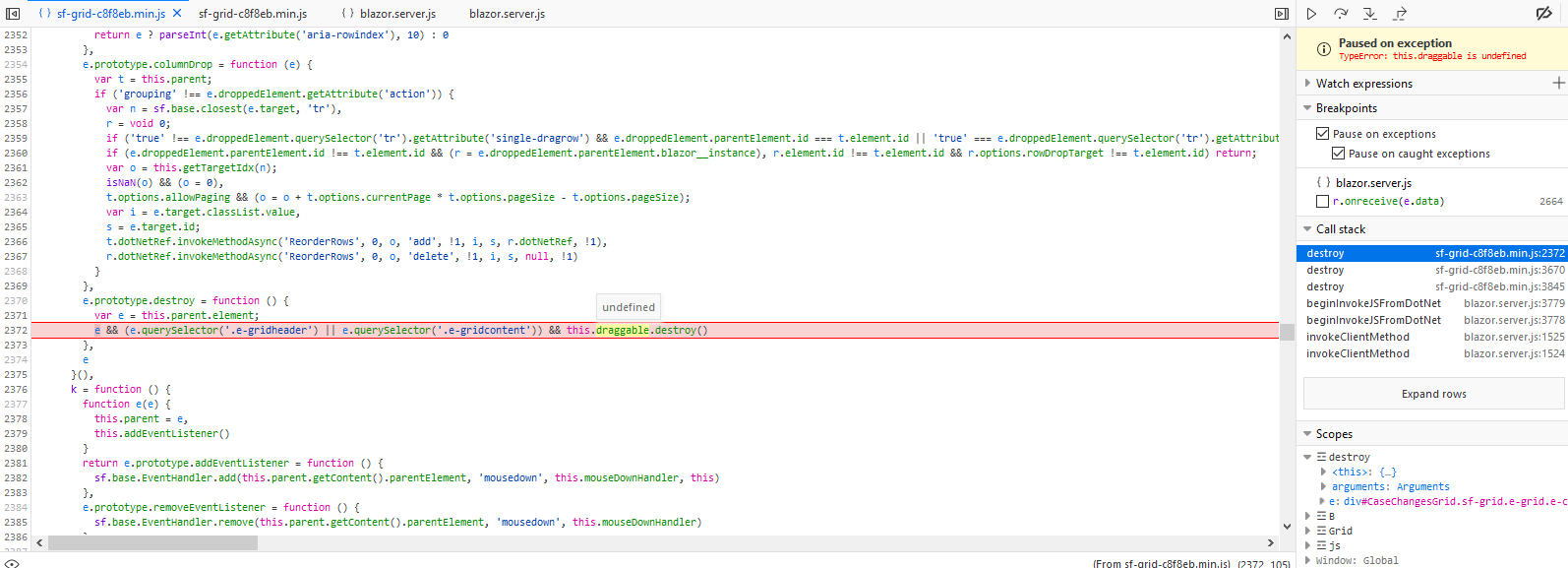 e.prototype.destroy in sf-grid*js is calling this.draggable.destroy(), but draggable is not defined.