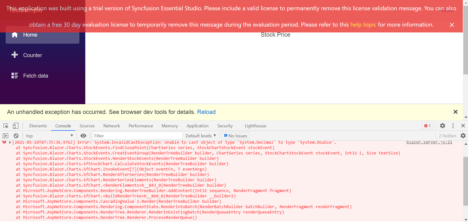 Stock chart is not rendered and throws console error while displaying stock events with decimal type.