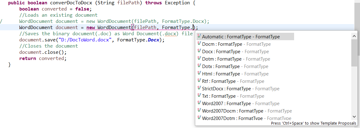 There is no constant for doc to docx conversion in FormatType and if I use other constants I get a invalid format exception.