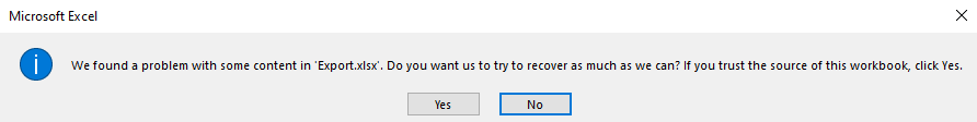 The exported Excel file from this pivot table is invalid, and Excel gives the following error message (attached) when trying to open the file: "We found a problem with some content in 'Export.xslx'. Do you want us to try to recover as much as we can? If you trust the source of this workbook, click Yes."