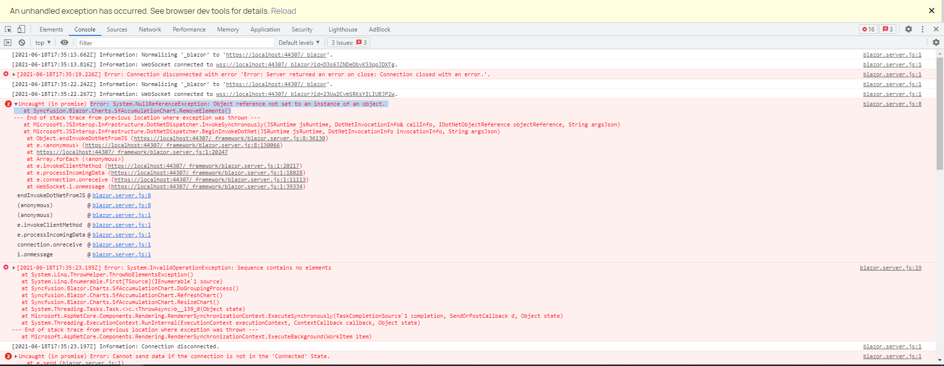 I am using syncfusion sp line area chart for blazor and I ran into multiple problems, first was that if I go to the page where syncfusion chart is used and then quickly navigate to the other page the application would crash.