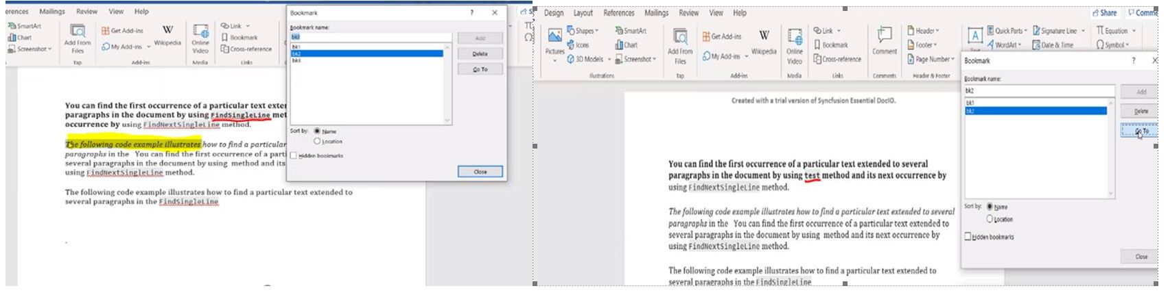 In the below screenshot(image1), the first and second paragraph is in a common bookmark “bk1”. In which we are trying to replace the word “FindSingleLine”(Underlined with red mark). In the