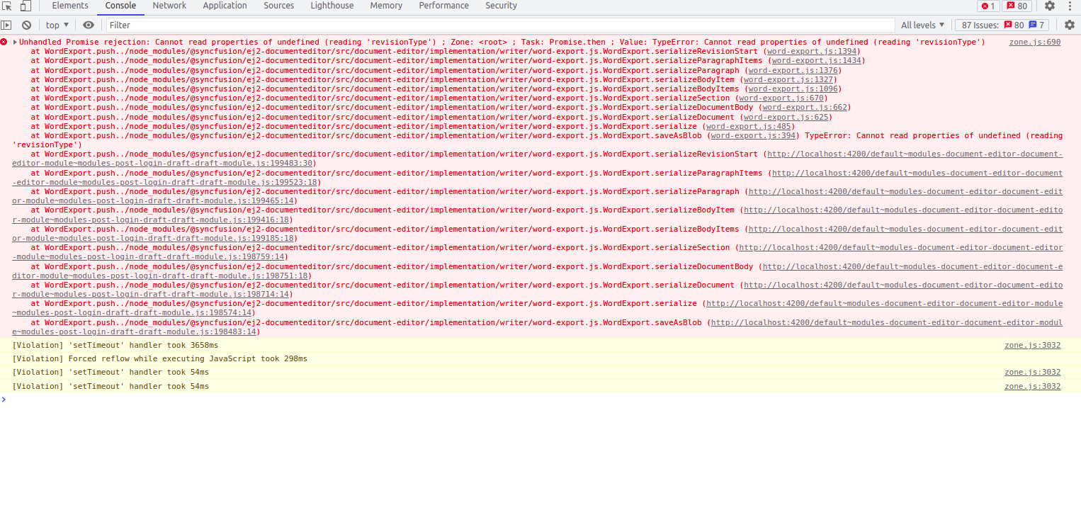 at WordExport.push../node_modules/@syncfusion/ej2-documenteditor/src/document-editor/implementation/writer/word-export.js.WordExport.saveAsBlob (word-export.js:394) TypeError: Cannot read properties of undefined (reading 'revisionType')