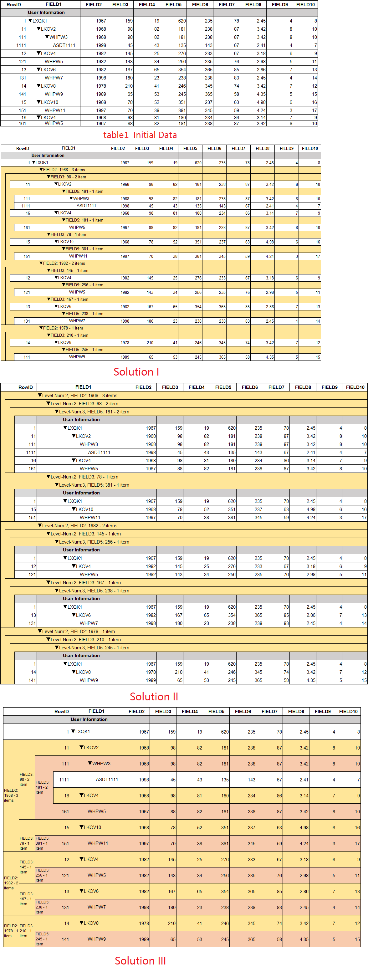 (there are four table, we want to group the data of 2nd level with FIELD2 and FIELD3, and group the data of 3rd level with FIELD5. )