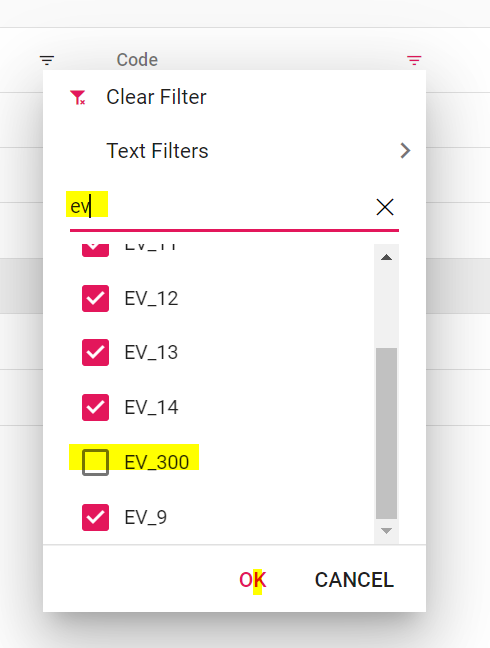 1. Initially, I opened the Excel Filter Dialog and search ‘EV' in the search bar. It shows the result in the popup. 2. Then I clicked the Filter button which filters all the available values. 3. Now, I changed one of the values ‘EV-30’ to ‘EV-300’. 4. after the save action, I opened the Excel Filter again and search 'EV’ in the search bar. 5. It should select all the values in the popup. but the newly edited value is shown as unchecked. This is not the expected behavior.