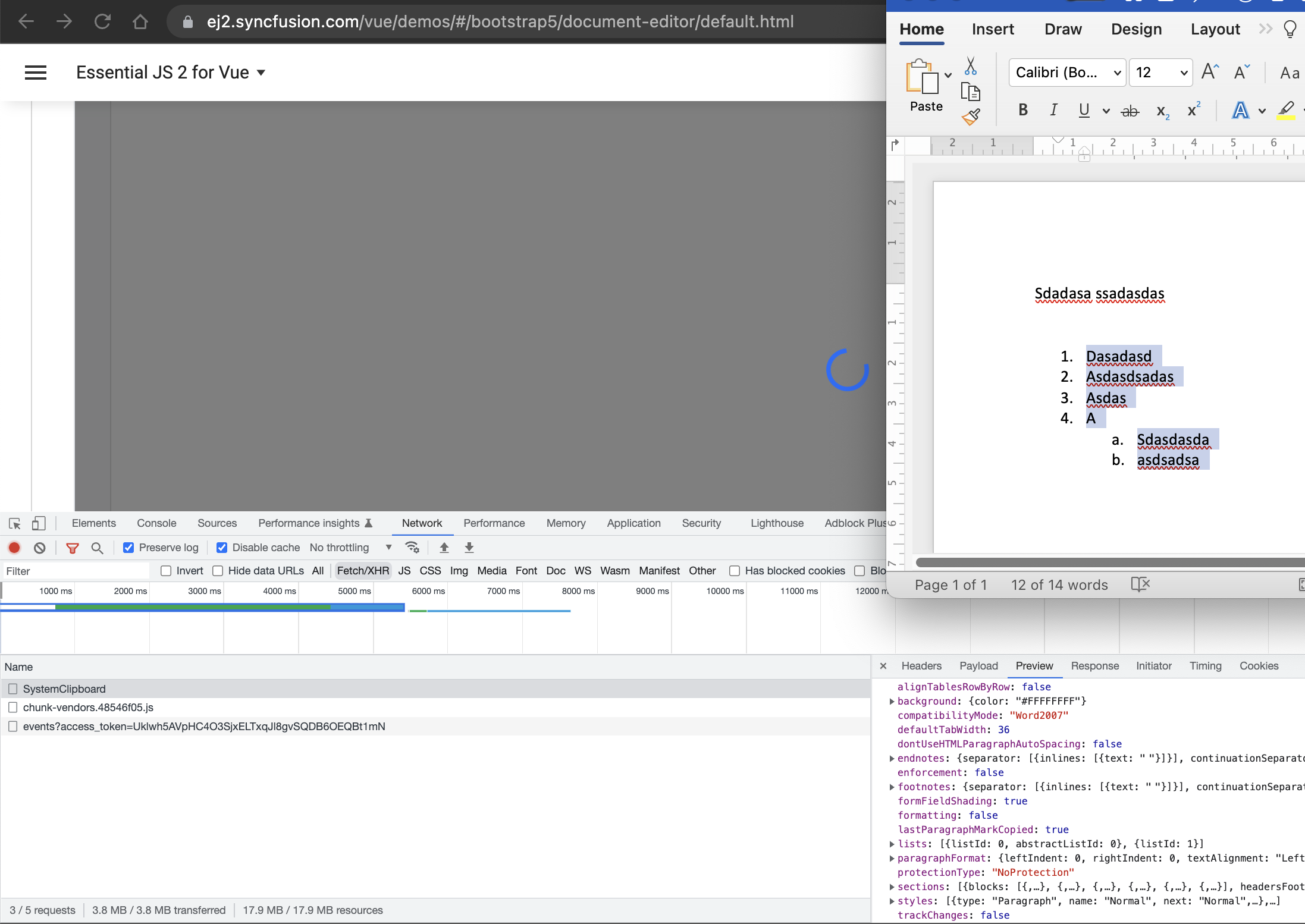 Loader animation and no return when copying content with multi level list / bullet from Ms Word 365 to Javascript Document Editor.