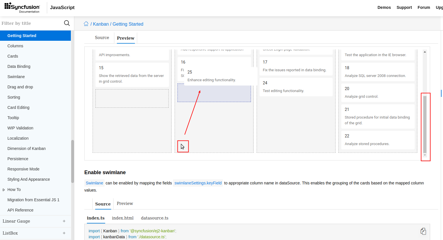 Create a simple Kanban, scroll down to the bottom of the Kanban, drag a Card and you will see a big gap between the pointer and the dragged Card, this bug already exists also in the documentation examples