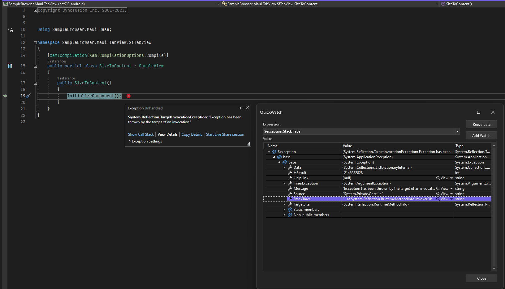 at SampleBrowser.Maui.TabView.SfTabView.SizeToContent.InitializeComponent() in C:\Syncfusion\MAUI\21.1.35\sample\MAUI\TabView\SampleBrowser.Maui.TabView\Microsoft.Maui.Controls.SourceGen\Microsoft.Maui.Controls.SourceGen.CodeBehindGenerator\Samples_TabView_SizeToContent_SizeToContent.xaml.sg.cs:line 26