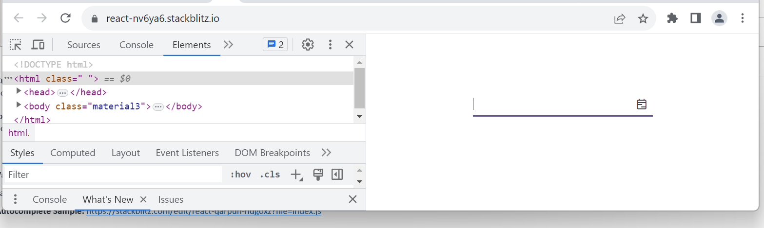 DatePicker Sample: https://stackblitz.com/edit/react-tcgv5j?file=index.js