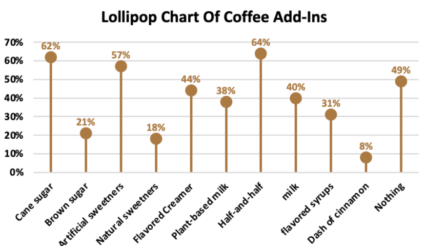 Lollipop chart: It is a variation of a bar chart that represents data points with a thin line and a circular marker at the end, resembling a lollipop.