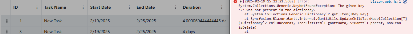 I keep encountering an error where if I try to indent a task after adding and deleting some tasks, I get the error message as seen in the attachment. I was wondering what might be causing this error. I am using the AddRecordAsync() method to insert tasks into the Gantt chart, then using the indent and outdent buttons on the toolbar.