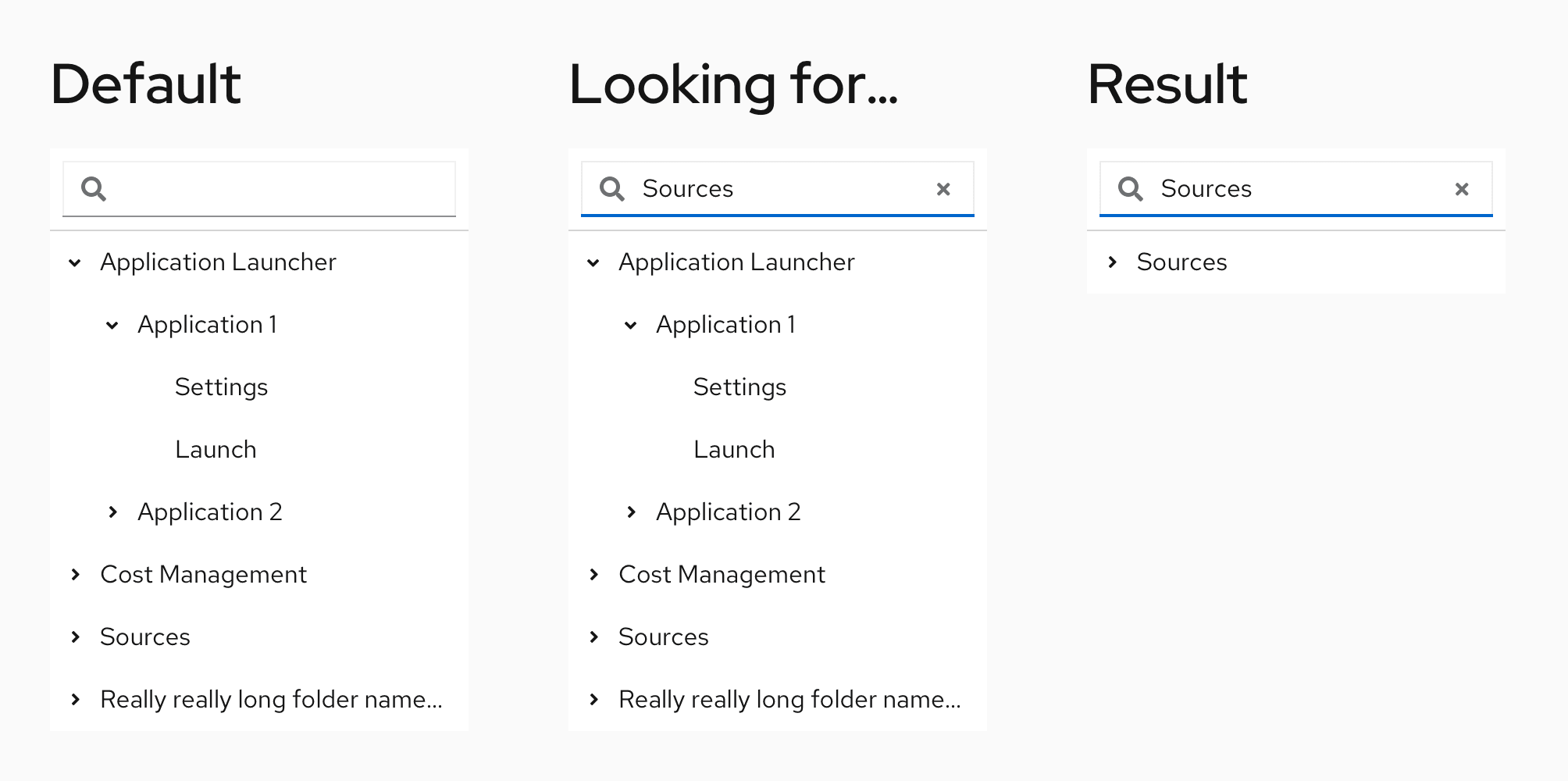 When a user types into the search box, it should filter and highlight the matching node in the TreeView while keeping the entire hierarchy visible (like the middle image: “Looking for…”).