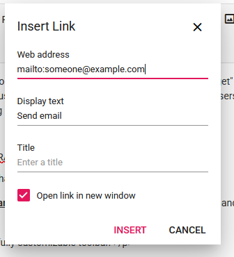 We are using the create link button from the toolbar like mailto:[email protected] but the editor adds additional https:// and this breaks the email link.