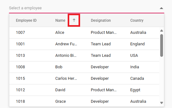 Sample: Sorting in Angular MultiColumn ComboBox component | Syncfusion