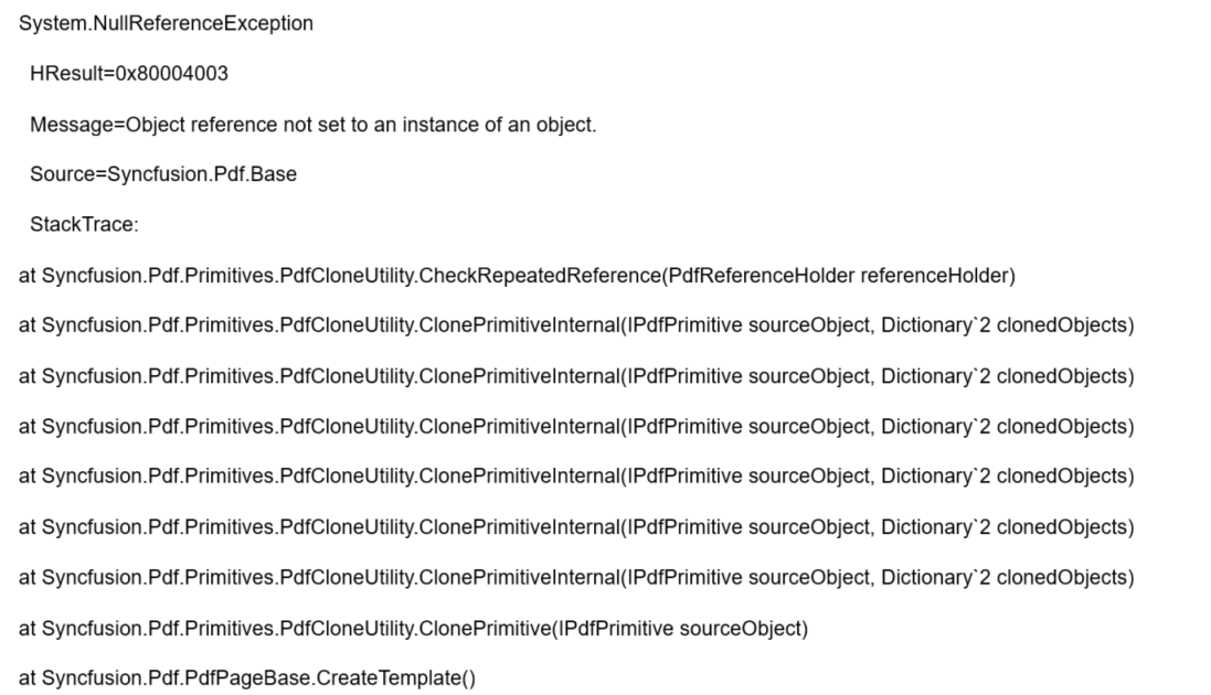 I am getting the following issues while using Syncfusion.Pdf.PdfPageBase.CreateTemplate() in version syncfusion.pdf.winforms\31.1.20 and upwards. But in syncfusion.pdf.winforms\31.1.19 I get no problem. I have also tried in the latest version syncfusion.pdf.winforms\31.2.4 but it fails while I used parallel processing. Note that if i use single thread then it shows no issues in all the versions. My project has so many steps to go to that path so i can not share the project here. I think for identifying this issue seeing the git diff of version 31.1.20 and 31.1.19 will be helpful. Currently, I am resuming my work in 31.1.19 because I need parallel processing.