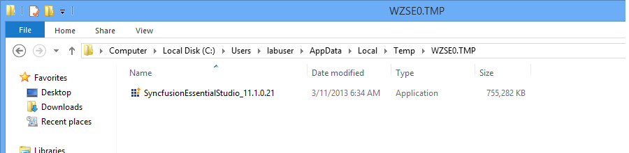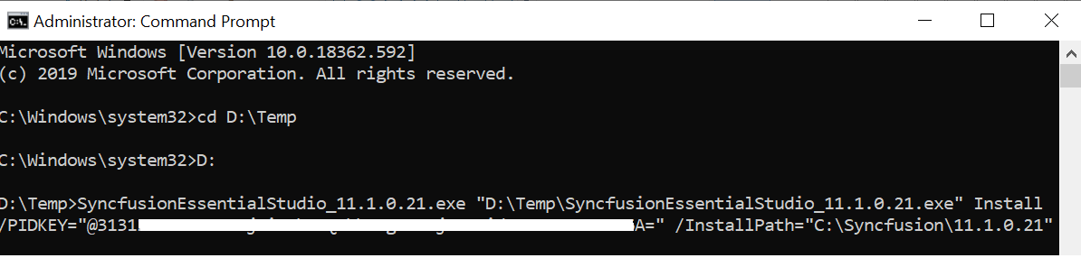 A) We found that you did not run the command prompt with administrator privileges from your previous update. So, we would request you to run the command prompt with administrator privileges and also to copy the “SyncfusionEssentialStudio_11.1.0.21.exe” from the temp location to some other drive( Ex: D:\temp) and then follow the steps given by us in our previous update to install our setup in silent installation method.