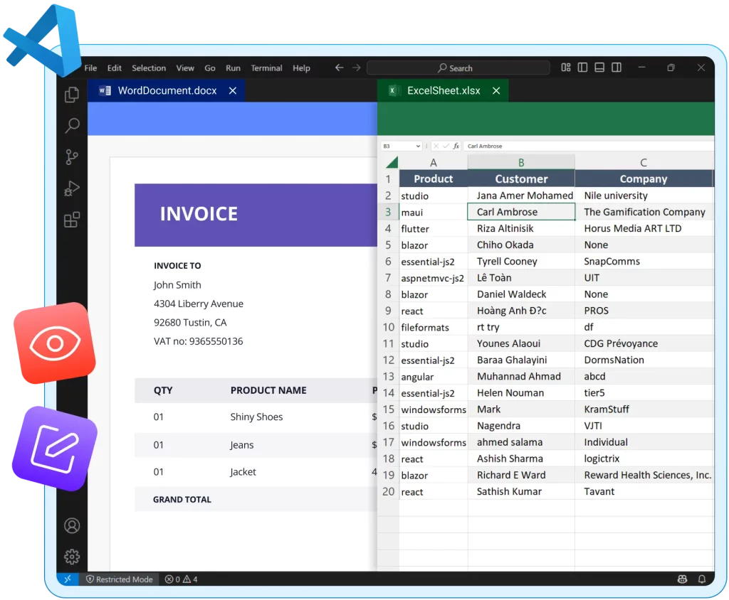 The Syncfusion® Document Viewer lets you open and view Word, Excel, PDF, CSV, and TSV files directly in the VS Code editor.