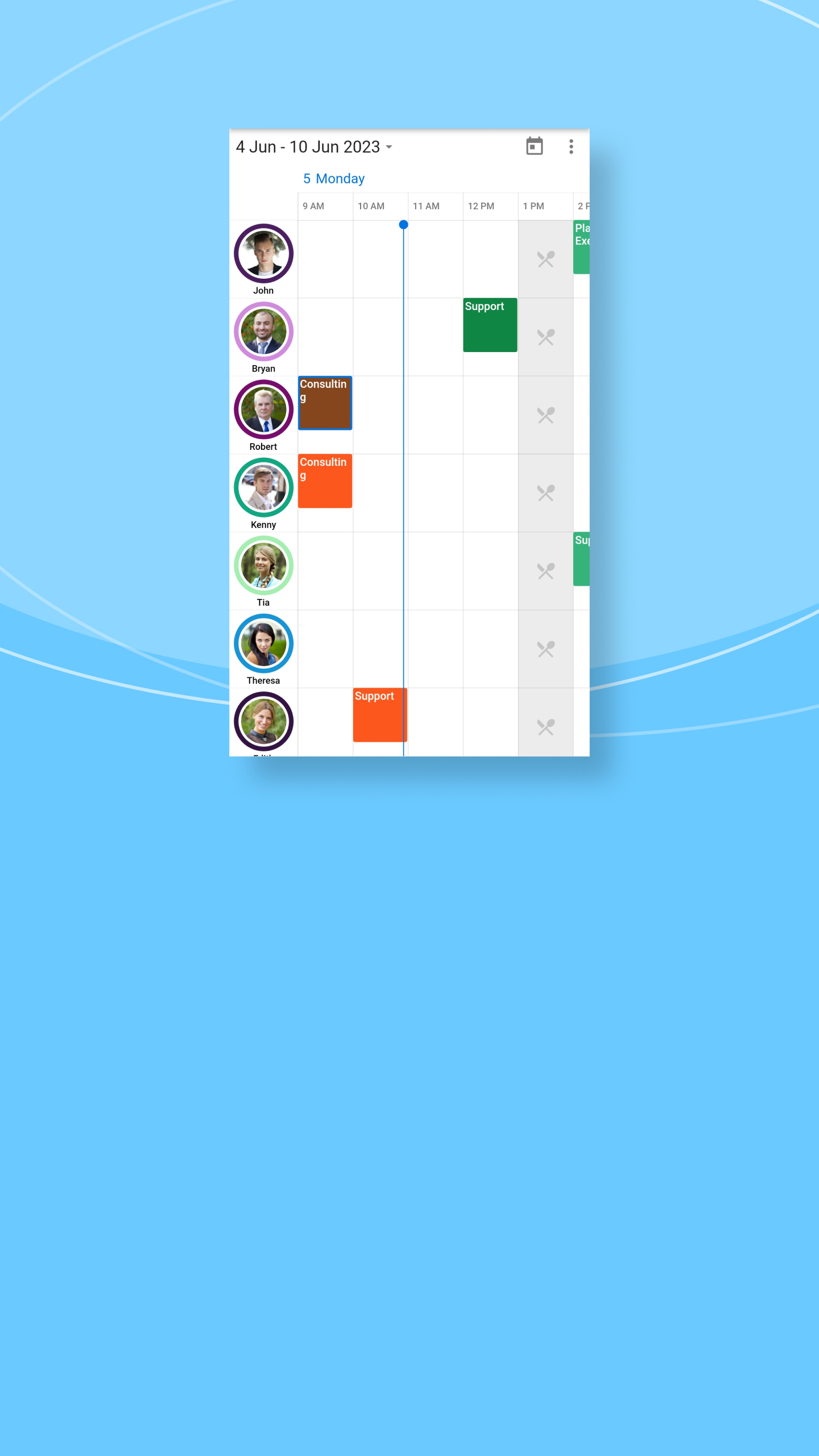 Present resources as a distinct layout integrated with a calendar, showcasing the scheduled appointments for each resource in a chronological view to improve visibility.
