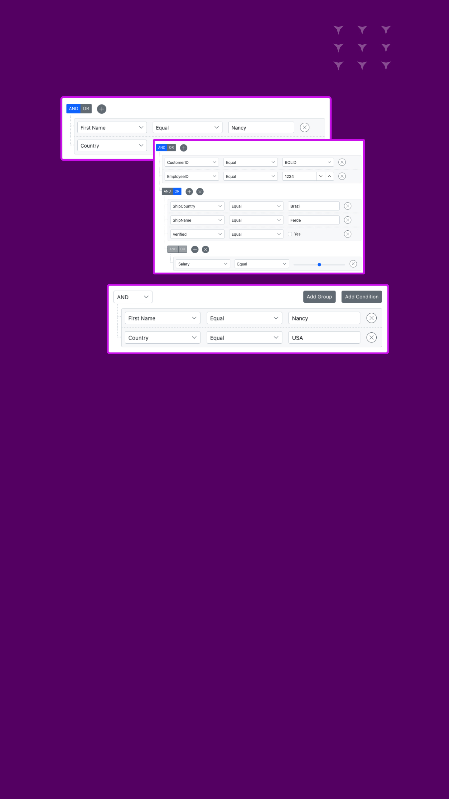 You can add checkboxes, sliders, and dropdown lists to the Query Builder using template options. With header, value, and rule templates, you can customize an entire column, its elements, and its values.