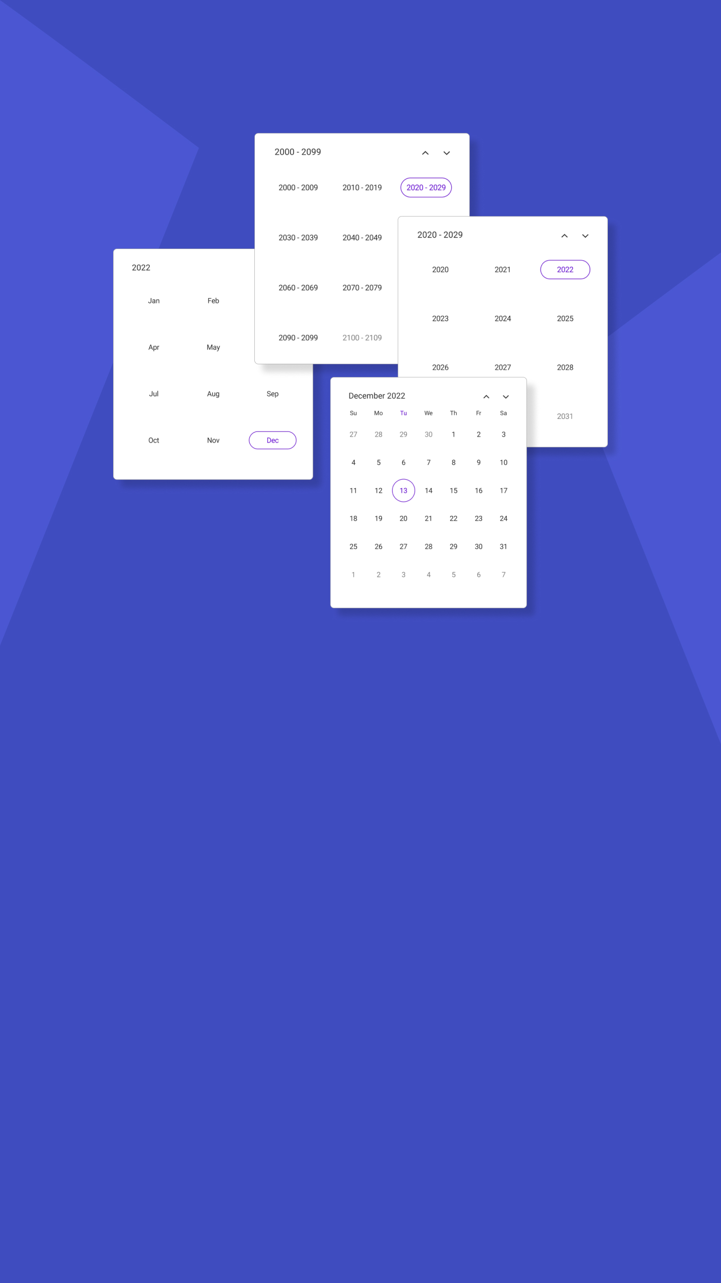The Calendar allows easy navigation to the desired dates by offering month, year, decade, and century views. To limit date selection, it supports setting minimum and maximum dates, as well as enabling past dates and disabling specific dates.