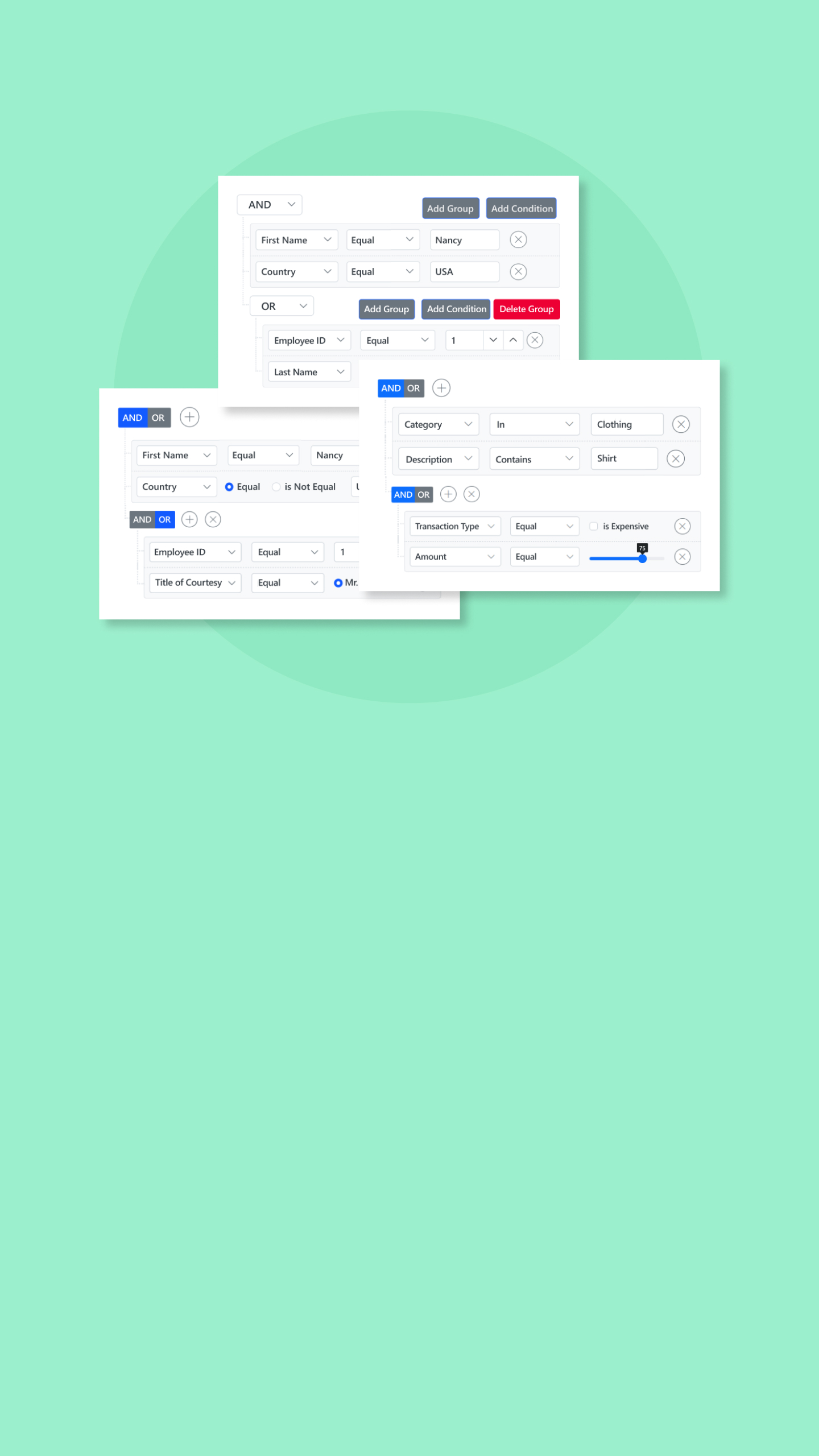 Users can interact with the user interface to create or delete conditions and groups in Vue Query Builder UI. This advanced query filter makes it easier for users to work.