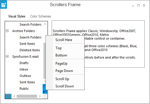 The scroller frame control comes with classic, Windows XP, and Office 2007 styles. The Office 2007 style can be set to blue, silver, or black color schemes.